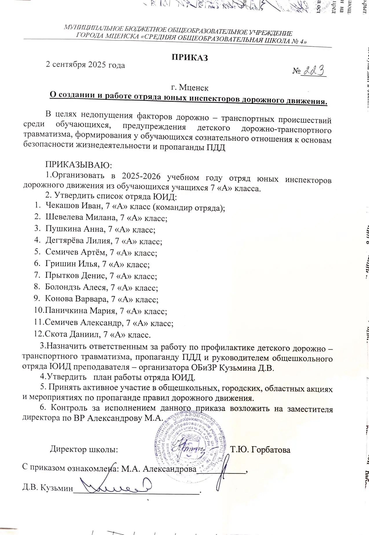 2025-2026 учебный год (Приказ о создании и работе отряда ЮИД)